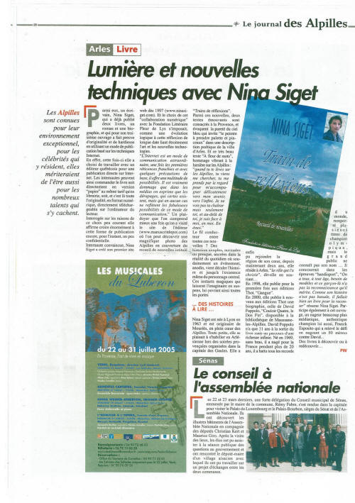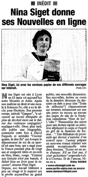 Le journal Les Alpilles (France) propose à ses lecteurs le recueil de nouvelles Train de réflexions de Nina Siget (cliquez sur la coupure de presse ci-dessous pour un agrandissement).