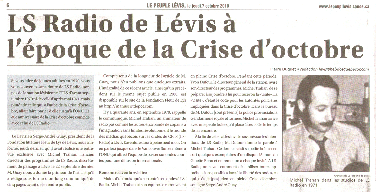 Article paru dans l'hebdomadaire régional Le Peuple Lévis le 7