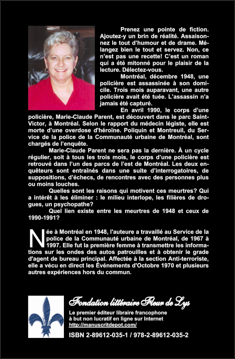 Née à Montréal en 1948, l'auteure a travaillé au Service de la police de la Communauté urbaine de Montréal, de 1967 à 1997. Elle fut la première femme à transmettre les informations sur les ondes des autos patrouilles et à obtenir le grade d'agent de bureau principal. Affectée à la section Antiterroriste, elle a vécu en direct les Événements d'Octobre 1970 et plusieurs autres expériences hors du commun. Retraitée depuis 1997, l'auteure est une autodidacte. Elle aime rire et a un bon sens de l’humour. Elle adore bien manger et cuisiner (sa spécialité sont les desserts). Ses loisirs se partagent entre la lecture, le vélo en été et le patin en hiver (sports qu’elle pratique avec son ami), le tricot, les mots croisés, les casse-têtes, la télévision. Un projet lui trottait depuis longtemps dans la tête et la retraite lui a permis de le réaliser. À l’aide de notes accumulées au fil des ans et de nombreux livres de recettes, elle a concocté, pour son plaisir personnel, un lexique culinaire titré: Qu’est-ce que c’est? Qu’est-ce que je fais? La cuisine de A à Z. C’est un lexique de 581 pages abondamment illustré. Le goût d’écrire l’a suivie toute sa vie mais il a pris vraiment son essor qu’au moment de sa retraite. Son parcours professionnel s’est effectué au Service de la police de la Communauté urbaine de Montréal, de 1967 à 1997. Employée auxiliaire au début et par la suite commis dactylo au Registre central, l’auteur a gravi tous les échelons de la hiérarchie pour terminer sa carrière à titre d’agent de bureau principal (poste jamais occupée auparavant par une femme). Première femme à transmettre les informations sur les ondes des radios patrouilles, elle devient rapidement agent de bureau. Affectée à la section Anti-terroriste, devenue par la suite la Section de la recherche sur la criminalité, elle vit en direct les Événements d’Octobre 1970. En 1973-1974, elle réussit les examens pour obtenir le grade d’agent de bureau principal. Elle est la première femme à être promue à ce titre en 1976. Poursuivant sa carrière à la Gestion du personnel policier et civil, elle est affectée à la supervision du personnel civil qui s’occupe de tous les mouvements (policiers et civils) du Service. L’auteure supervisera le travail civil à la Gestion des documents et, par la suite, à la section Identification judiciaire. Suite à la restructuration de cette section en 1995, elle termine sa carrière, en 1997, à la Direction des ressources financières et physiques à titre d’agent comptable. Au cours de sa carrière, elle a eu le privilège de vivre des expériences hors commun, mais ça, c’est une autre histoire qu’elle vous racontera peut-être un jour. Elle sera la première femme admise au Temple de la renommée de la Section Renseignements, du Service de la police de la Ville de Montréal.