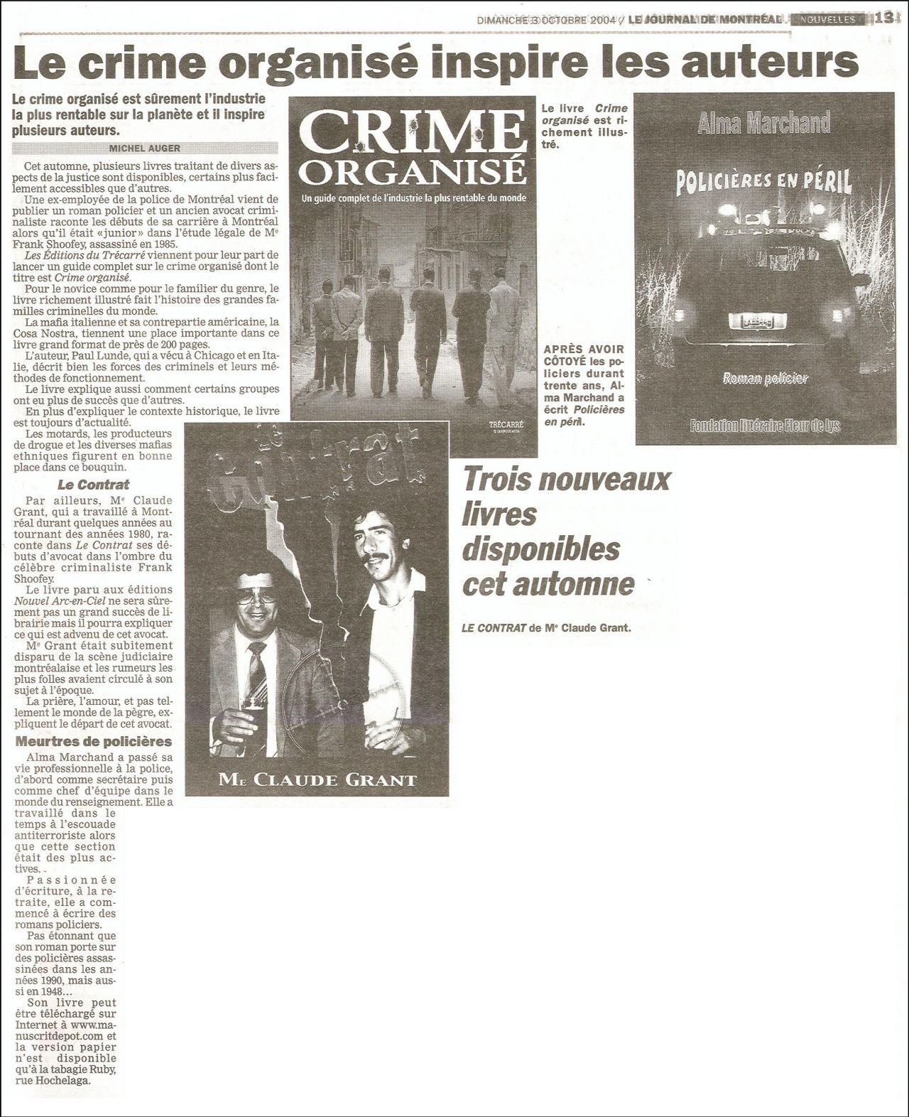 Le Journal officiel de l'Associations des retraités de la Ville de Montréal Inc., consacre un article sa chronique lecture à une ancienne employée du Service de police de Montréal, Alma Marchand, auteur du roman policier Policières en péril (cliquez sur la coupure de presse ci-dessous pour un agrandissement).