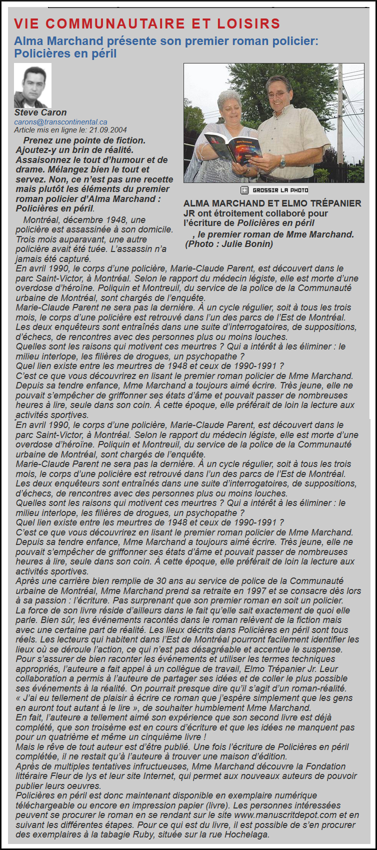 Article paru dans l'hebdomadaire Montréalais LE FLAMBEAU DE L'EST VIE COMMUNAUTAIRE ET LOISIRS Alma Marchand présente son premier roman policier: Policières en péril