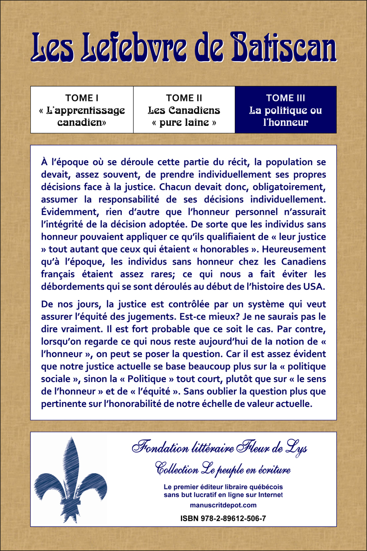 ANDRÉ LEFEBVRE Les Lefebvre de Batiscan Tome I - « L'apprentissage canadien » Tome II - Les Canadiens « pure laine » Tome III - La politique ou l'honneur Roman historique Fondation littéraire Fleur de Lys Lévis, Québec, 2016, 258 pages ISBN 978-2-89612-505-0 Exemplaire numérique gratuit (PDF)
