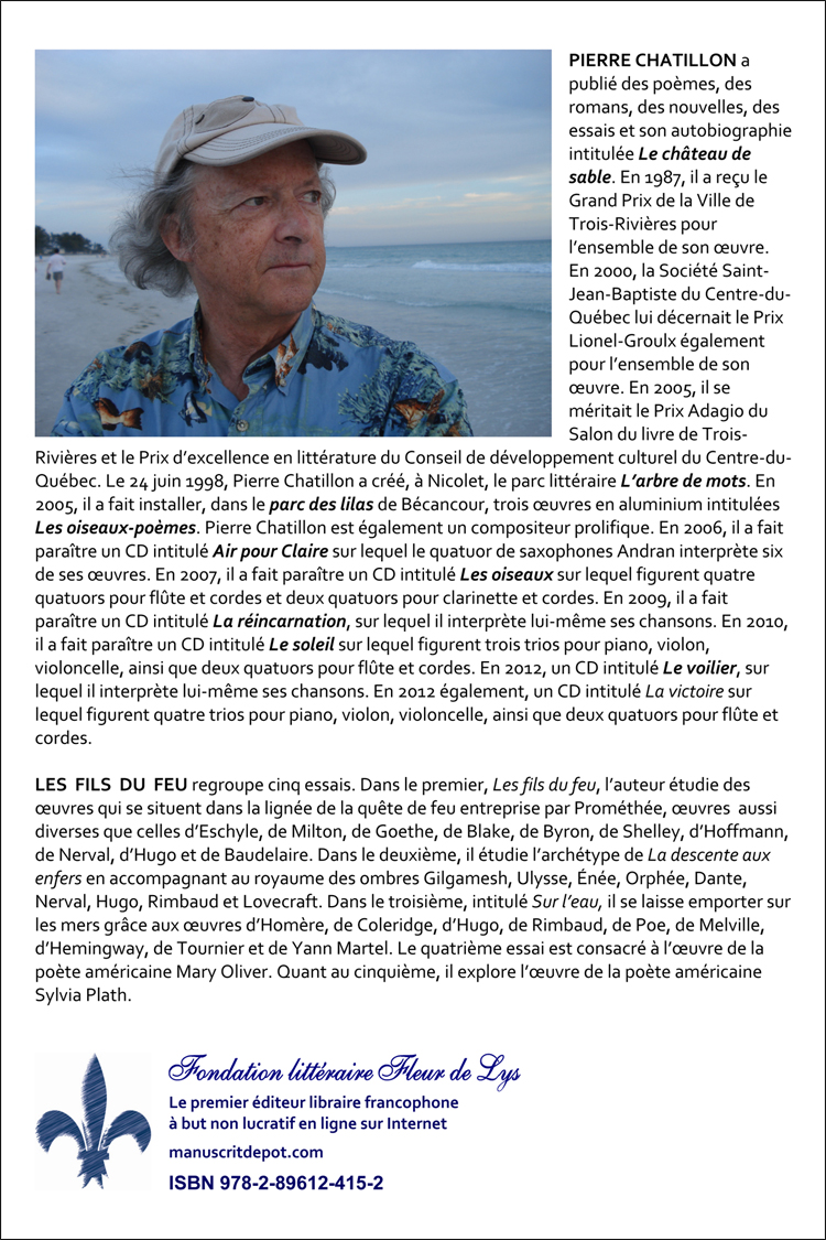 PIERRE CHATILLON a publié des poèmes, des romans, des nouvelles, des essais et son autobiographie intitulée Le château de sable. En 1987, il a reçu le Grand Prix de la Ville de Trois-Rivières pour l’ensemble de son œuvre. En 2000, la Société Saint-Jean-Baptiste du Centre-du-Québec lui décernait le Prix Lionel-Groulx également pour l’ensemble de son œuvre. En 2005, il se méritait le Prix Adagio du Salon du livre de Trois-Rivières et le Prix d’excellence en littérature du Conseil de développement culturel du Centre-du-Québec. Le 24 juin 1998, Pierre Chatillon a créé, à Nicolet, le parc littéraire L’arbre de mots. En 2005, il a fait installer, dans le parc des lilas de Bécancour, trois œuvres en aluminium intitulées Les oiseaux-poèmes. Pierre Chatillon est également un compositeur prolifique. En 2006, il a fait paraître un CD intitulé Air pour Claire sur lequel le quatuor de saxophones Andran interprète six de ses œuvres. En 2007, il a fait paraître un CD intitulé Les oiseaux sur lequel figurent quatre quatuors pour flûte et cordes et deux quatuors pour clarinette et cordes. En 2009, il a fait paraître un CD intitulé La réincarnation, sur lequel il interprète lui-même ses chansons. En 2010, il a fait paraître un CD intitulé Le soleil sur lequel figurent trois trios pour piano, violon, violoncelle, ainsi que deux quatuors pour flûte et cordes. En 2012, un CD intitulé Le voilier, sur lequel il interprète lui-même ses chansons. En 2012 également, un CD intitulé La victoire sur lequel figurent quatre trios pour piano, violon, violoncelle, ainsi que deux quatuors pour flûte et cordes.