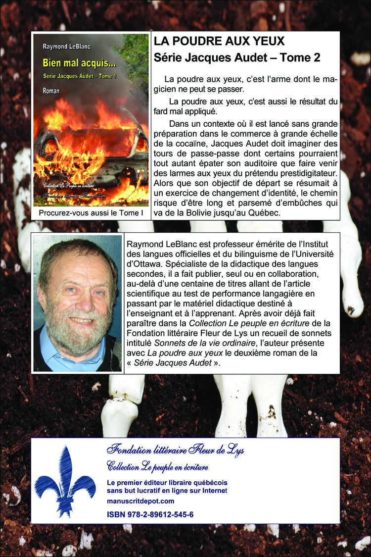 La poudre aux yeux Roman policier Série Jacques Audet - Tome 2 Raymond LeBlanc Fondation littéraire Fleur de Lys Lévis, Québec, 2017, 554 pages ISBN 978-2-89612-545-6 Exemplaire papier : non disponible : non disponible : non disponible : 39.95$PRÉSENTATION La poudre aux yeux, c’est l’arme dont le magicien ne peut se passer. La poudre aux yeux, c’est aussi le résultat du fard mal appliqué. Dans un contexte où il est lancé sans grande préparation dans le commerce à grande échelle de la cocaïne, Jacques Audet doit imaginer des tours de passe-passe dont certains pourraient tout autant épater son auditoire que faire venir des larmes aux yeux du prétendu prestidigitateur. Alors que son objectif de départ se résumait à un exercice de changement d’identité, le chemin risque d’être long et parsemé d’embûches qui va de la Bolivie jusqu’au Québec. EXTRAIT CHAPITRE 57