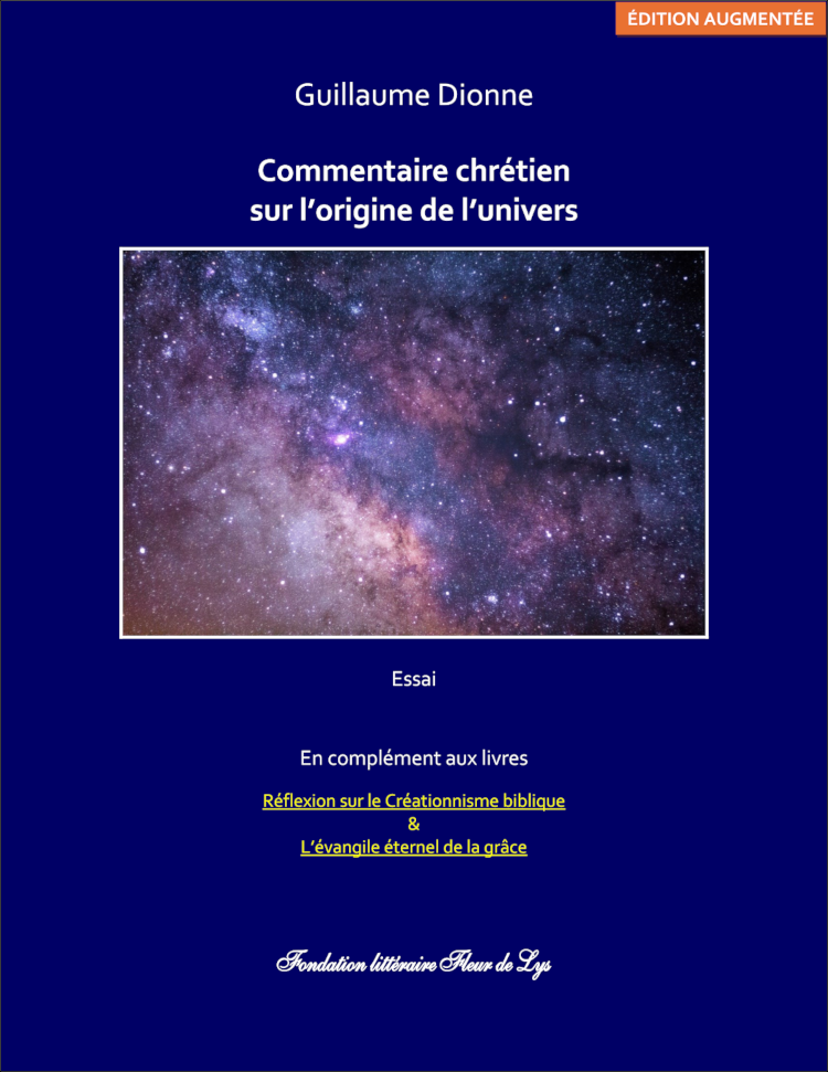 Commentaire chrétien sur l’origine de l’univers En complément aux livres Réflexion sur le Créationnisme biblique et L’évangile éternel de la grâce Guillaume Dionne, Fondation littéraire Fleur de Lys, Lévis, Québec, 2022, 5 pages. ISBN 978-2-89612-627-9 Exemplaire numérique gratuit (PDF)