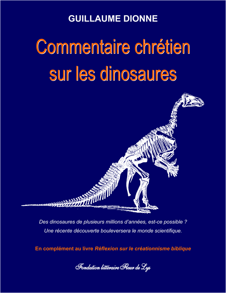 Commentaire chrétien sur les dinosaures En complément au livre Réflexion sur le créationnisme biblique Exemplaire gratuit sur ce site web (PDF) Essai, Guillaume Dionne, Fondation littéraire Fleur de Lys, Lévis, Québec, 2023, 20 pages. ISBN 978-2-89612-638-5 Exemplaire numérique gratuit (PDF)