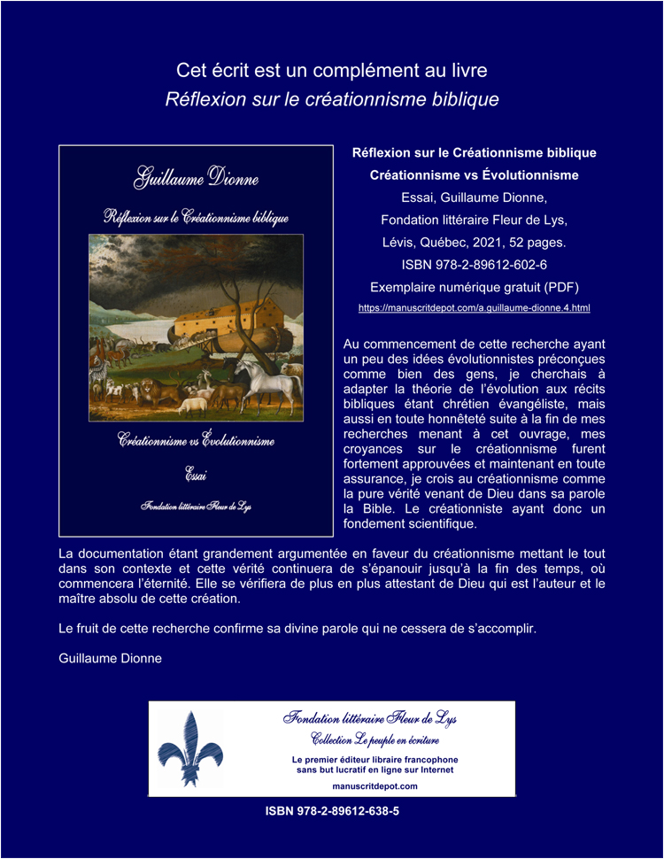 En complément au livre Réflexion sur le créationnisme biblique Essai, Guillaume Dionne, Fondation littéraire Fleur de Lys, Lévis, Québec, 2023, 20 pages. ISBN 978-2-89612-639-2