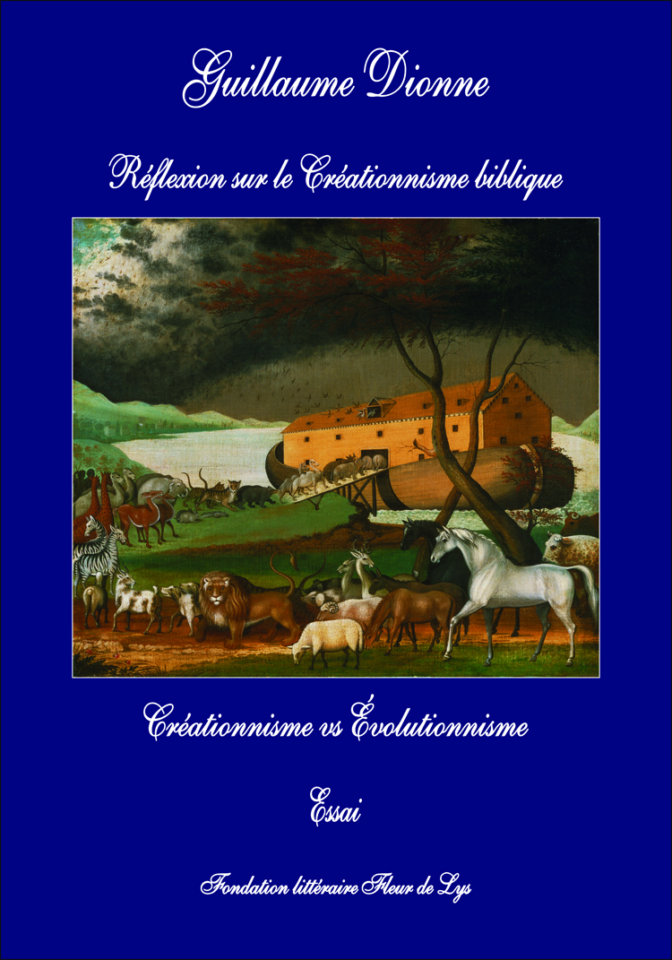 Réflexion sur le Créationnisme biblique Créationnisme vs Évolutionnisme Essai, Guillaume Dionne, Fondation littéraire Fleur de Lys, Lévis, Québec, 2021, 52 pages. ISBN 978-2-89612-602-6