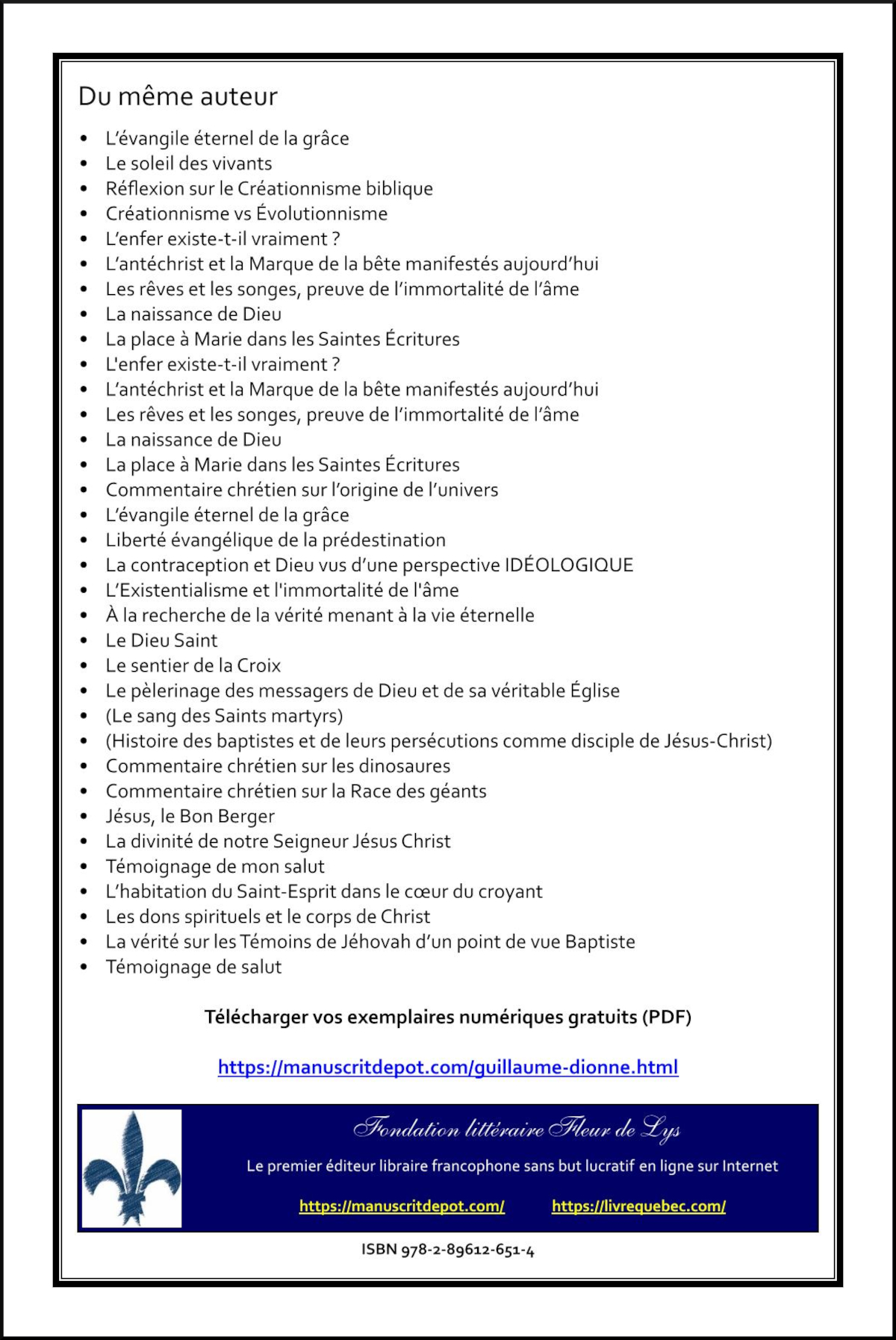 Liberté évangélique de la prédestination & La contraception et Dieu vus d’une perspective IDÉOLOGIQUE Essai, Guillaume Dionne, Fondation littéraire Fleur de Lys, Lévis, Québec, 2022, 33 pages. ISBN 978-2-89612-630-9