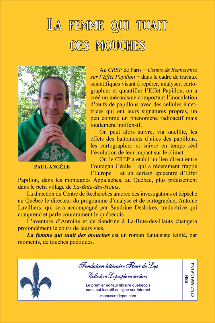 La femme qui tuait des mouches Roman Paul Angèle Fondation littéraire Fleur de Lys, Lévis, Québec, 2021, 158 pages, illustré. ISBN 978-2-89612-619-4 Exemplaire papier : non disponible PRÉSENTATION Au CREP de Paris − Centre de Recherches sur l’Effet Papillon − dans le cadre de travaux scientifiques visant à repérer, analyser, cartographier et quantifier l’Effet Papillon, on a créé un mécanisme comportant l’inoculation d’œufs de papillons avec des cellules émet¬trices qui ont leurs signatures propres, un peu comme un phénomène radioactif mais totalement inoffensif.