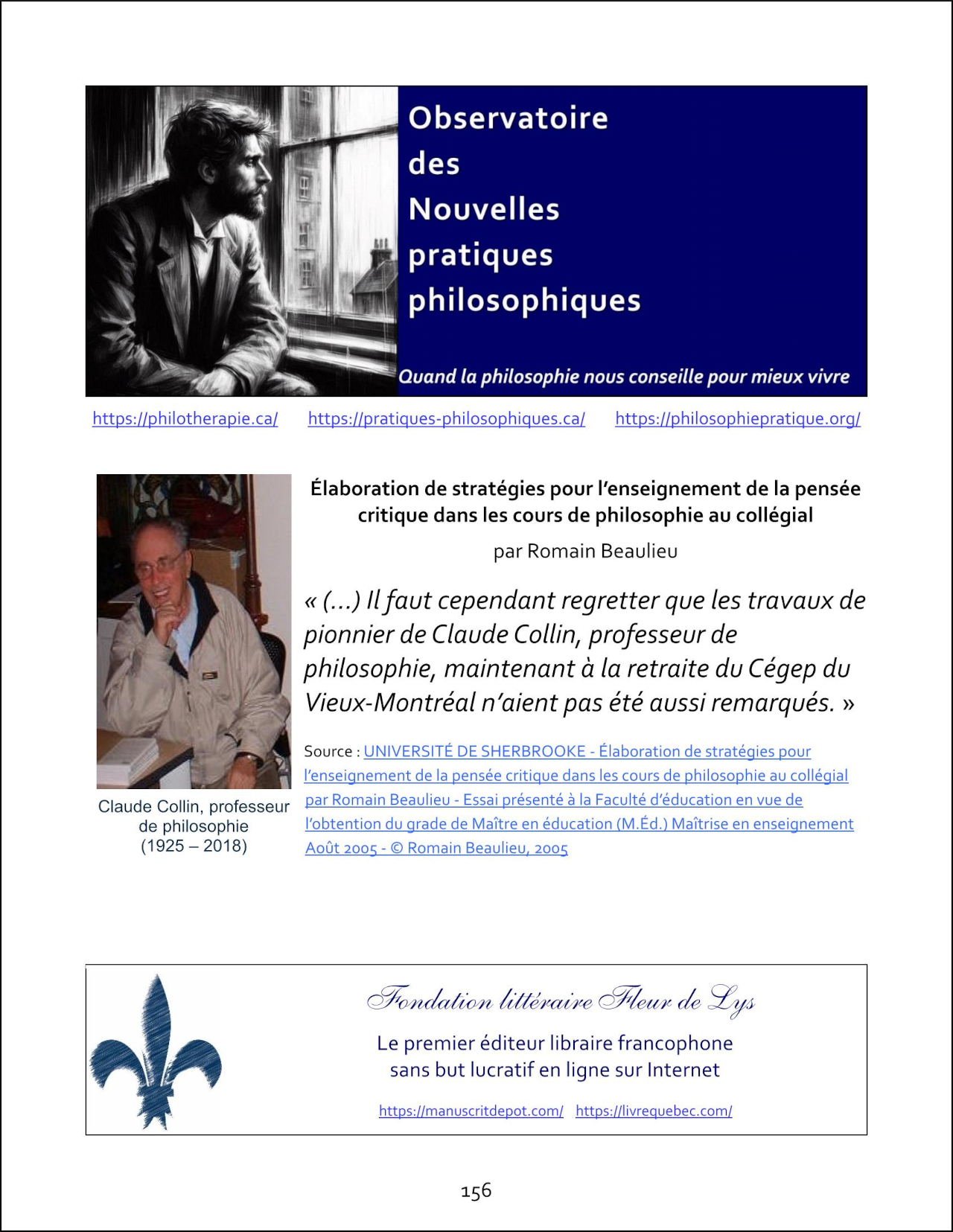 DOCUMENT # 1LIENS DE TÉLÉCHARGEMENTLIEN DE TÉLÉCHARGEMENTOULIEN DE TÉLÉCHARGEMENTDOCUMENTS HOMMAGETÉLÉCHARGEMENT GRATUIT (pdf) Tous les documents en hommage à Claude Collin Cliquez ici ou sur l'image ci-dessous Besoin d'aide ? Fondation littéraire Fleur de Lys Téléphone : 581-988-7146 Courriel : contact@manuscritdepot.com Le présent site est géré par la Fondation littéraire Fleur de Lys 31, rue St-Joseph, Lévis, Québec, Canada. G6V 1A8 Téléphone : 581-988-7146 Courriel : contact@manuscritdepot.com La Fondation littéraire Fleur de Lys décline toute responsabilité quant au contenu des autres sites auxquels elle pourrait se référer. MENU DE CE SITE WEB Centre d'information sur les droits d'auteur Centre d'information sur l'édition et le nouveau monde du livre © Claude Collin © Fondation littéraire Fleur de Lys 2026