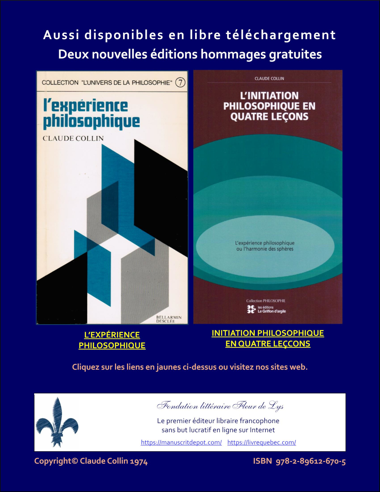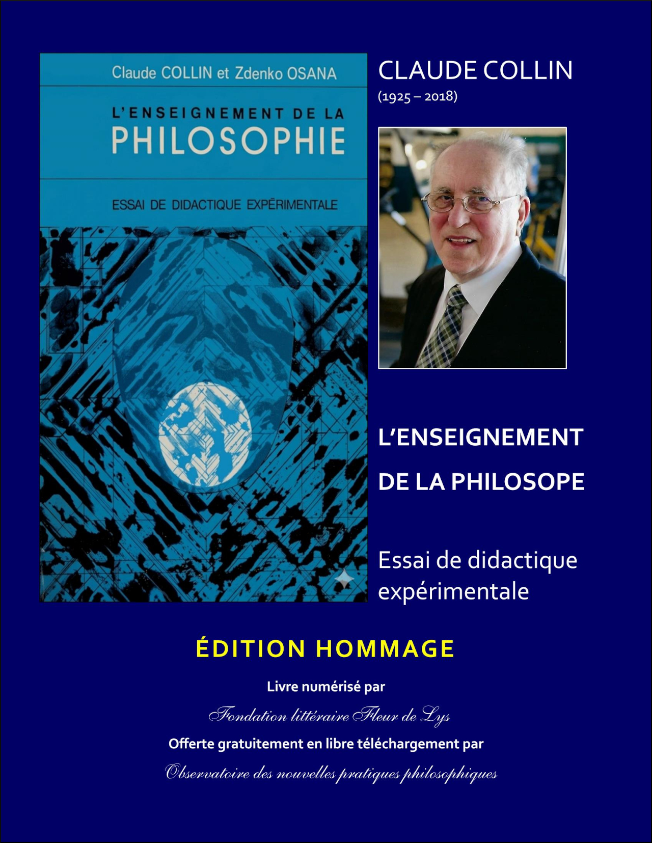 Fondation littéraire Fleur de Lys LIEN DE TÉLÉCHARGEMENTHommage à Claude Collin (1925 – 2018) Professeur de philosophie, pionnier de la didactique de l’enseignement de la philosophie au collégial (Québec) Claude Collin (1925 – 2018) a développé une position didactique dite « expérimentale », centrée sur l’expérience philosophique et sur le processus de penser plutôt que sur un simple apprentissage technique de contenus. L’idée est de concevoir l’enseignement de la philosophie non pas comme une succession d’exercices formels, mais comme une mise en situation réflexive où l’étudiant engage son expérience intérieure et son rapport au sens philosophique. Ce point de vue, longtemps marginal dans les programmes collégiaux, s’inscrit dans une critique générale de l’éducation qui cherche à donner du sens à l’acte de philosopher plutôt qu’à en faire un ensemble de compétences mesurables ou un simple savoir transmis.