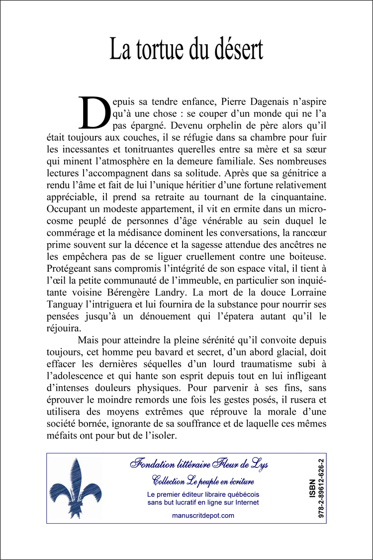 La tortue du désert Thriller psychologique Jean Dumas Fondation littéraire Fleur de Lys, Lévis, Québec, septembre 2022, 258 pages. Exemplaire papier : non disponible PRÉSENTATION Depuis sa tendre enfance, Pierre Dagenais n’aspire qu’à une chose : se couper d’un monde qui ne l’a pas épargné. Devenu orphelin de père alors qu’il était toujours aux couches, il se réfugie dans sa chambre pour fuir les incessantes et tonitruantes querelles entre sa mère et sa sœur qui minent l’atmosphère en la demeure familiale. Ses nombreuses lectures l’accompagnent dans sa solitude. Après que sa génitrice a rendu l’âme et fait de lui l’unique héritier d’une fortune relativement appréciable, il prend sa retraite au tournant de la cinquantaine. Occupant un modeste appartement, il vit en ermite dans un microcosme peuplé de personnes d’âge vénérable au sein duquel le commérage et la médisance dominent les conversations, la rancœur prime souvent sur la décence et la sagesse attendue des ancêtres ne les empêchera pas de se liguer cruellement contre une boiteuse. Protégeant sans compromis l’intégrité de son espace vital, il tient à l’œil la petite communauté de l’immeuble, en particulier son inquiétante voisine Bérengère Landry. La mort de la douce Lorraine Tanguay l’intriguera et lui fournira de la substance pour nourrir ses pensées jusqu’à un dénouement qui l’épatera autant qu’il le réjouira. Mais pour atteindre la pleine sérénité qu’il convoite depuis toujours, cet homme peu bavard et secret, d’un abord glacial, doit effacer les dernières séquelles d’un lourd traumatisme subi à l’adolescence et qui hante son esprit depuis tout en lui infligeant d’intenses douleurs physiques. Pour parvenir à ses fins, sans éprouver le moindre remords une fois les gestes posés, il rusera et utilisera des moyens extrêmes que réprouve la morale d’une société bornée, ignorante de sa souffrance et de laquelle ces mêmes méfaits ont pour but de l’isoler. EXTRAIT CHAPITRE 1