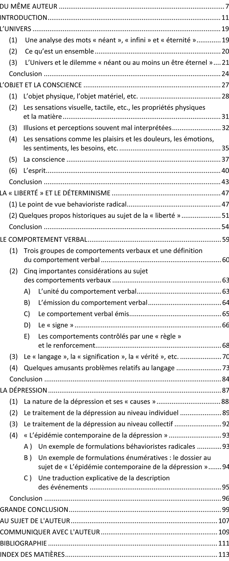 AU SUJET DE L'AUTEUR JEAN-PIERRE BACON Jean-Pierre Bacon est né à Montréal, Québec, Canada, en 1953. Ses années de scolarité l’ont mené à l’obtention du diplôme de deuxième cycle de la faculté des arts et des sciences de l’Université de Montréal. Il a été professeur de physique et de mathématiques au Collège de Montréal, membre du Conseil de cette institution historique, membre de sa commission pédagogique et de son comité de mesures d’appui pédagogique (duquel un livre est issu: Pour être gagnante... techniques de réussite scolaire, publié aux Éditions Beauchemin, en 1991), responsable de deux départements... Ajoutons qu’il y a décliné une invitation sérieuse d’y être directeur. Il est officiellement à la retraite depuis 1994 et s’est adonné intensément depuis à la recherche menant au présent ouvrage. Il a donc de multiples intérêts artistiques et scientifiques. En d’autres champs, il a œuvré quelques années au niveau du baseball mineur, à titre de joueur, puis d’instructeur, il joue présentement au tennis, en plus de faire du bénévolat en ce domaine, et, récemment, il a été proche aidant à la maison, puis dans les centres hospitaliers de soins de longue durée, ce qu’il fut passionnément, en essayant d’apporter du réconfort et des services à plusieurs autres démunis. DU MÊME AUTEUR JEAN-PIERRE BACON Tous les grands problèmes philosophiques sous l'éclairage de la science des contingences de renforcement Le behaviorisme radical et les grands problèmes philosophiques Essai, Jean-Pierre Bacon, Fondation littéraire Fleur de Lys Exemplaire numérique gratuit (les 3 tomes) PDF