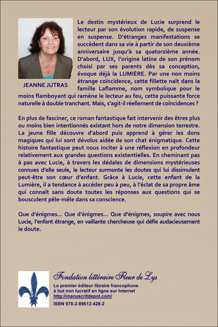 Le destin mystérieux de Lucie surprend le lecteur par son évolution rapide, de suspense en suspense. D’étranges manifestations se succèdent dans sa vie à partir de son deuxième anniversaire jusqu’à sa quatorzième année. D’abord, LUX, l’origine latine de son prénom choisi par ses parents dès sa conception, évoque déjà la LUMIÈRE. Par une non moins étrange coïncidence, cette fillette naît dans la famille Laflamme, nom symbolique pour le moins flamboyant qui ramène le lecteur au feu, cette puissante force naturelle à double tranchant. Mais, s’agit-il réellement de coïncidences ?